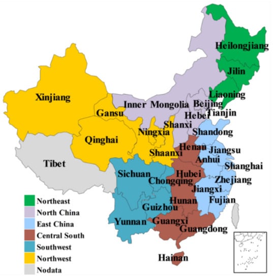 In light of the comprehensive factors concerning economic and social development and geographical location, the 30 provinces are divided into six regions (see Figure 2), namely, northeast, north, east, central-south, southwest, and northwest.