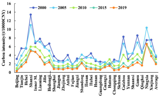 (1) The majority of provinces, excluding Hainan, Ningxia, Shanxi, and Xinjiang, experienced a significant downtrend in CEI during the period of 2000–2019. Nevertheless, the spatial–temporal distribution of CEI features a dramatic unevenness, which is characterized by the coexistence of “high in the west and low in the east” and “high in the north and low in the south”, and the gap between the north and the south appears to be substantially greater than that between the east and the west.