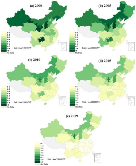 Figure 3 and Figure 4 present the spatial–temporal evolutionary paths of CEI for each province from 2000 to 2019. Generally, China’s CEI showed a pronounced downward trend from 2000 to 2019, with distinct differences among provinces. From a dynamic perspective, CEI showed an upward trend during the period of 2000–2005, peaking at approximately 4 t/104 CNY. During the period of 2005–2019, the CEI in China experienced a rapid decline, especially from 2005 to 2010, and, thereafter, the decline began to slow down. The phenomenon above is attributed to the fact that during the 10th Five-Year Plan (2000–2005), China was in the rapid industrial development stage. Therefore, the growth of the economy was heavily dependent on large-scale resource consumption, coupled with inefficient technology management and a sloppy development pattern, which generated substantial carbon emissions. Afterward, the Chinese government began to emphasize energy conservation and emission reduction, and China’s CEI presented a significant reduction. Up to 2019, China’s CEI dropped by more than 45% from 2005 (from 3.926 t/104 CNY to 1.938 t/104 CNY), reaching the 2020 reduction target earlier than expected.
