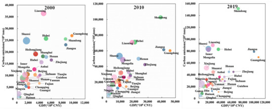 Distribution of GDP and carbon emissions in 30 provinces (in 2000, 2010, and 2019). Note: The size of the circle represents CEI. The higher the CEI, the larger the circle.