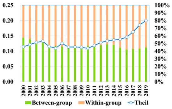 Equations (3) and (4) represent the within-group and between-group Theil indexes , respectively, which decompose to evaluate the impacts of regional variations on the total value in Equation (5) [21].