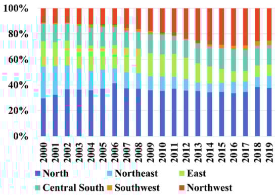 Figure 7 presents the trend regarding the contribution of regional CEI disparities to aggregate disparity. The Theil index exhibits distinct features in each region. The contribution of regional disparities concerning CEI to aggregate disparity varies dramatically. The northern region consistently contributes the most, with a solid share of some 35%. The contribution of the northwest region has been increasing since 2005, while that of the northeast and east has been decreasing year by year. Throughout the study period, the Theil index in the southwest remained fairly flat, and the contribution rate was rather moderate, indicating that the CEI in this region was rather balanced.