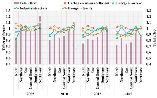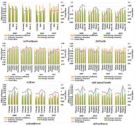 For carbon emission factors, the decomposition values of the north, northeast, and northwest are consistently greater than 1, which denotes that the regions perform behind the reference. Their counterparts in the central-south and southwest regions are in the opposite direction. Although the values for the eastern region are greater than 1, the effect is rather weak (from 1.0022 to 1.0071), indicating that the effect of carbon emission factors in the east is almost close to the reference region.