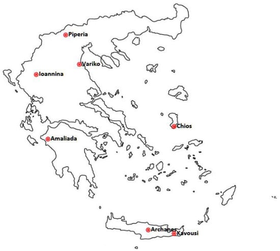 A total of 47 rosemary plants were selected from seven populations, wild-grown in seven different natural environments, in Greece, namely: Amaliada, Ioannina, Chios, Variko, Piperia, Archanes, and Kavousi (Figure 1). The morphological characteristics, the durability, the vigor, and the shape of the plants selected were the main criteria for their selection. In addition, the selected populations came from greatly different habitats of Greece, aiming at a sufficient biodiversity of rosemary plants for the needs of this study. The number of collected plants of the aforementioned rosemary populations, and the coordinates of the regions of origin, are presented in Table 1.