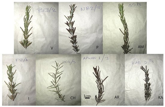 Terminal branches taken from the previous year vegetation, of the seven wild-grown R. officinalis populations, from the regions of Variko (V), Piperia (P), Amaliada (AM), Ioannina (I), Chios (CH), Archanes (AR), and Kavousi (KA).