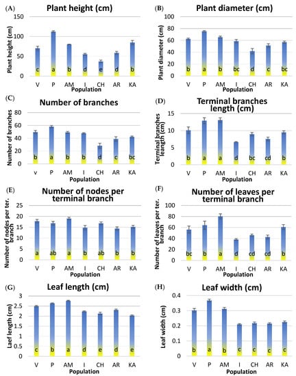 Mean values for eight morphological traits of ornamental use [(A) plant height (cm), (B) plant diameter (cm), (C) number of terminal branches per plant, (D) terminal branches length (cm), (E) number of nodes per branch, (F) number of leaves per terminal branch, (G) leaf length (cm), (H) leaf width (cm)] measured on the plants of the seven populations of Rosmarinus officinalis: ‘Variko’ (V), ‘Piperia’ (P), ‘Amaliada’ (AM), ‘Ioannina’ (I), ‘Chios’ (CH), ‘Archanes’ (AR), and ‘Kavousi’ (KA). Different letters, in columns for each of the traits, indicate statistically significant differences, according to Duncan’s multiple range test at p ≤ 0.05.