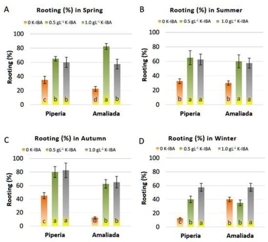 Effect of K-IBA and season [(A) spring, (B) summer, (C) autumn, and (D) winter] on the rooting (%) of R. officinalis ‘Piperia’ and ‘Amaliada’ shoot cuttings. Different letters, in columns for both populations in each season, indicate statistically significant differences, according to Duncan’s multiple range test at p ≤ 0.05.