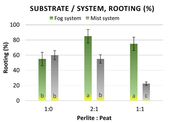 2.3.3. Effect of Substrate and Rooting System on Rooting of Cuttings