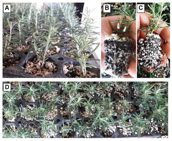 In this study, the addition of activated charcoal was also an essential factor for the rooting of cultures of both rosemary populations in vitro. The positive effect of activated charcoal on rooting was also demonstrated for conifers, which are generally considered as species that are difficult to root, such as Pinus pinaster [69]. Tien Vinh et al. [57] concluded that 1 g·L−1 of activated charcoal is the most effective concentration to achieve the maximum number and length of shoots, as well as roots, in vitro in lavender cultures.