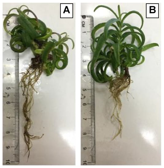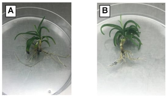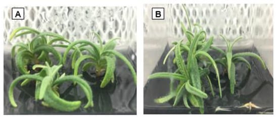‘Amaliada’ (A) and ‘Piperia’ (B) plantlets with developed roots, after 5 weeks in MS nutrient medium, supplemented with 0.5 mg·L−1 BAP and 0.1 mg·L−1 IAA.