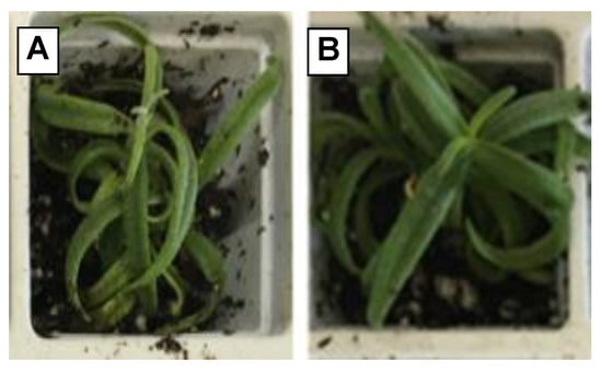 Acclimatized plantlets of ‘Amaliada’ (A) and ‘Piperia’ (B) at the end of the 4-week acclimatization period.