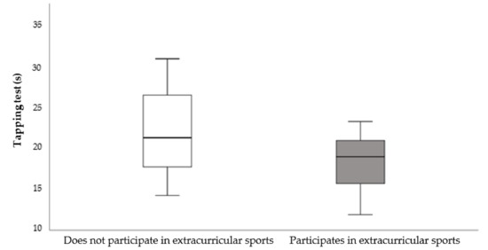 Significant differences (p = 0.016) were found in upper limb movement speed in the tapping test (Figure 1), with lower times obtained by those who participated in extracurricular sports (18.20 s) compared to those who did not (21.78 s).