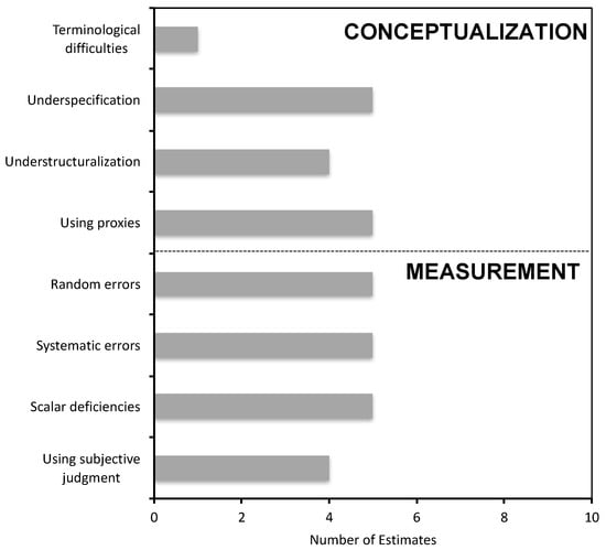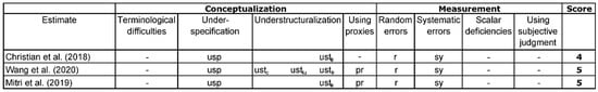 Conceptualization uncertainties: terminological difficulties (te); underspecification (usp); understructuralization (ust); and using proxies (pr).