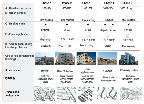 As shown in Figure 1, Phase I describes the mass housing development from 1950–1974 in the fenced-off Varosha territory from 1950–1960 during the British colonial administration. Varosha and its coastline consisted of single-storey bungalows and two-storey detached houses after the 1960 independence of Cyprus from the British administration [16]. It can be seen that the coastline was handed over to overseas developers where all the high-rise RTBs were built within a 14-year period of rapid mass housing development. According to housing statistics from 1974, 34,000 residential projects were constructed in the Varosha territory; however, this development came to a standstill in 1974 due to the civil war, and the city has been closed to human habitation ever since [17].