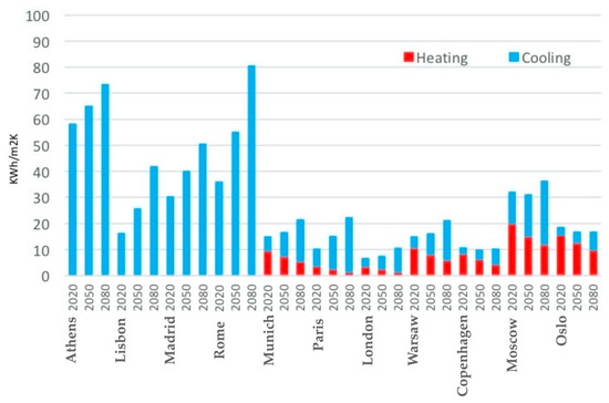 Heating and cooling energy consumption of dwellings in capital cities in Europe in 2020, 2050, and 2080. Source: Brotas and Nicol (2016) [67].