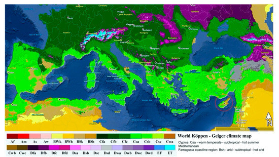 Cypriot climates are determined by geographical positions in the northeast corner of the Mediterranean Sea, the morphological characteristics of ground plains, and the meteorological variations of the region [85]. According to the Köppen climate classification system (World Köppen climate classification data was reviewed; the dataset is available to researchers), Cypriot climate characteristics are typical of the Mediterranean region. Köppen climate data show that the overall climate type for Cyprus is subtropical (Csa) and partly semi-arid (Bsh) in the northeast part of the island [86]; this means that Cyprus is hot and dry during the summertime, as illustrated in Figure 4.