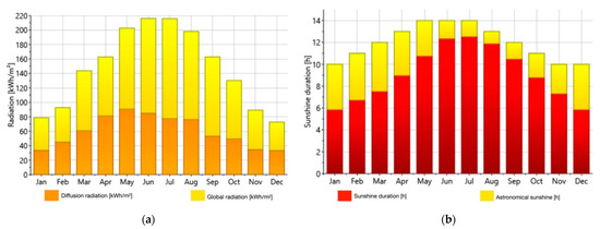 Environmental conditions of case-study location: (a) solar irradiance; (b) sunshine hours.
