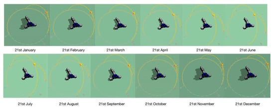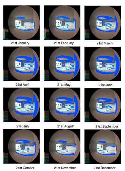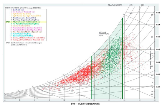 Figure 6 demonstrates the psychometric chart that can be utilised to plot the temperature and relative humidity (RH) occurring over a period of 2.385 of 8.760 h in accordance with the annual weather climate data generated from the Energy Plus weather database. EnergyPlus is an open-source whole-building energy-simulation program; the EnergyPlus weather format (i.e., .epw) is compatible with the weather data for more than 2100 locations (https://energyplus.net/weather, accessed on 7 March 2021). This illustrates different comfort index parameters that are represented by specific zones on the psychometric chart. Furthermore, the percentage of hours that fall into different design strategy zones offer a relative understanding of the solar irradiance factor and thermal-absorptivity levels of building envelopes.