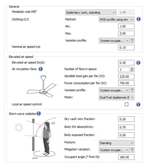 The IES version used throughout was IES-VE 2021.1.0.0. Specifically, the Thermal Comfort assessment task of the IES-VE software suite was found to be an application that could measure the ‘adaptive thermal comfort’ of a prototype RTB [96]. It is also of interest to consider that in combination with the Dynamic Thermal Simulation (DTS) components of the IES-VE software, it was possible to assess the energy performance of material changes concurrently. To assess the energy performance of a prototype RTB, thermal templates were constructed in the IES platform of Apache-Sim. These templates defined the space conditioning systems (Apache Systems) and gain variation profiles for zones within the building, as shown in Table 2.