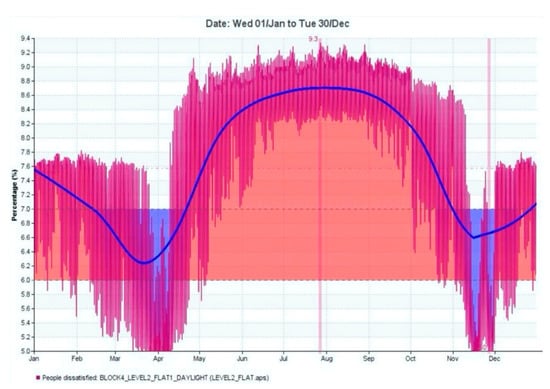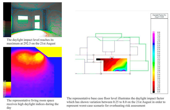 To fulfill the research aims and objectives, the periods were spread throughout the summer with the aim of measuring the risk of overheating in the RTBs. In each of the occupied zones (i.e., living rooms and master bedroom spaces), calibration studies of the characteristics needed for energy use per area (naturally or mechanically) in order to consider occupancy, the electrical energy use of equipment, internal temperature, and the energy use of artificial lighting and of mechanical plants (A/C units) were conducted. The aim of the selection was to capture a variety of space energy uses using relatively simple assessment benchmarks to import the data to the IES simulation software. This was carried out for the purpose of assessing the validity of simulation results by investigating the daylight impact factor on each occupied space and the thermal properties of representative apartment units’ under-investigation.