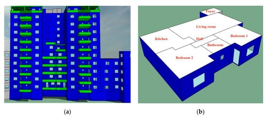 The case study building is representative of high-rise residential developments constructed by privately owned construction companies in the 1950s and 1970s [91]. The conditioned gross floor area of the case study multi-family apartment unit is 75 m2. The original U-values were 2.35 W/m2K for external walls, 1.23 W/m2K for internal walls, 1.2 W/m2K for the roof, and 2.10 W/m2K for the windows and doors. Thermal specifications of construction materials were made according to the benchmarks of the British Construction Codes and Practices—Law 1959, which was the most recent data set available at the time of undertaking the research for this study [92,93].
