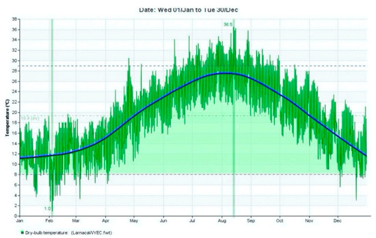 A climatological analysis of the research context reveals that hot, dry summers and moderate, wet winters are the primary climate characteristics for Cyprus and have a direct impact on annual cooling and heating demands due to the need for space conditioning in the summer and winter [89]. Famagusta demonstrates mild Mediterranean climate characteristics. Maximum Dry Bulb Temperature (DBT) can reach as high as 42 °C in the summer; minimum DBT can drop down to 6°C in the winter [89]. Mean-minimum DBT varies from 6.8 to 22.3 °C, and mean-maximum DBT varies from 16.3 to 33.3 °C [89].