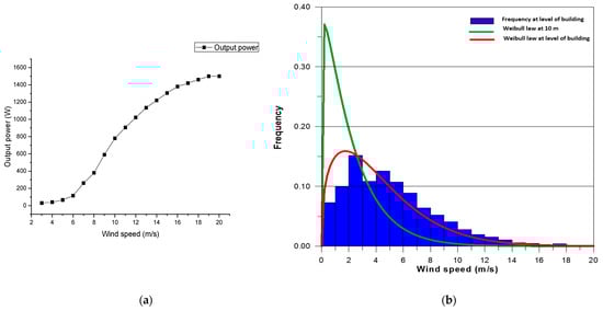 where c is the scale factor (m/s); k is the shape factor (dimensionless); V is the calculated wind speed at height Z. In addition, hourly wind speed data available at 10 m was used to estimate electricity generation, and the Weibull wind speed distribution was estimated and extrapolated to the turbine hub height using the Energy Law model. Matlab software was used for this step. Figure 5 shows the wind turbine power produced, Weibull wind speed and the wind turbines position on the roof of the building.