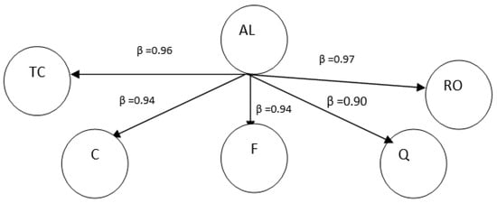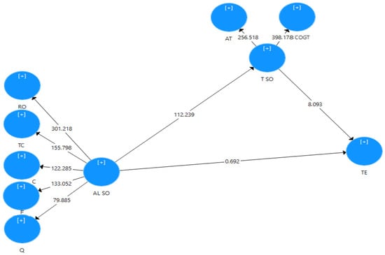 The Preacher and Hayes [78] technique was used for testing the indirect effects among variables. The mechanism of the mediation process is as follows: Y is a variable affecting as a mediator if X affects Y, X affects Z, and Y significantly affects Z when controlling for X, and the effects of X on Z reduce significantly when Y is placed in the model simultaneously with X as an interpreter of Z [78]. Table 5 shows the results of hypotheses, including paths, betas and significance levels. Regarding the direct effects of AL, the results demonstrated that AL was not significantly associated with TE (β = 0.07; p > 0.05), and H1 is not supported. However, the findings provide empirical evidence in support of a direct relationship between AL and T; hence, H2 is supported (β = 0.96; p < 0.01). Moreover, the results showed that T was significantly and positively associated with TE (β = 0.81; p < 0.01), fully supporting H3.