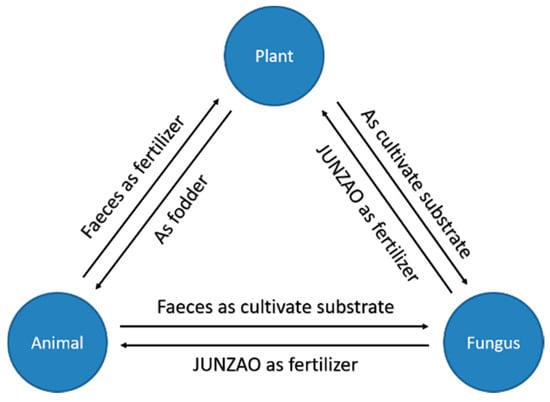 JUNCAO, e.g., Dicranopteris pedata [1], Neyraudia reynaudiana [2], Phragmites australis [3] and Pennisetum gigantium z.x.Lin [4], Pennisetum purpureum Schumach [5], Medicago sativa L. [6], is a kind of herbaceous plant that is able to nourish edible and medicinal fungi [7]. JUNCAO types have several good properties including strong stress resistance, high yield, abundant crude protein and sugar content, and developed root system which can also show good performance in remediating the stony desertification or desertification [8]. The application of JUNCAO to cultivate edible and medicinal fungi is called JUNCAO technology [7]. JUNCAO is also regarded as livestock forage and serves as an economic nutrient source [9]. Therefore, development of the JUNCAO industry favors the nutrient management and safe production of a livestock–fungi–plant system (Figure 1) [7,10]. In addition, the developed root system and strong stress resistance of JUNCAO benefits their function in ecological management [4,8]. Besides, JUNCAO can also serve as a renewable biomass fuel [11].