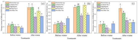 The nutrient contents of diverse JUNCAOs before and after winter. Different letters among the treatments in same group indicate there is significant difference among them (p < 0.05). (a–c) represent the nitrogen, phosphorus and potassium contents of JUNCAOs respectively.