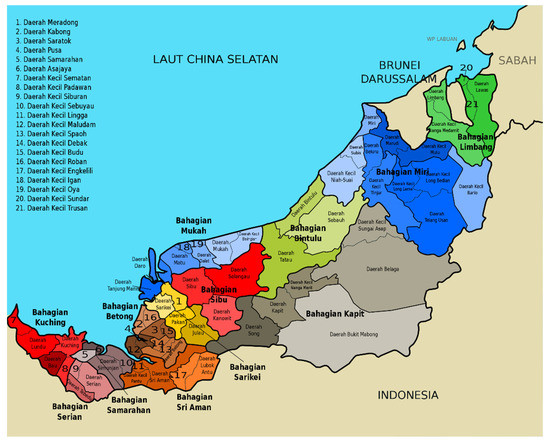 - Sarawak. Category: Sarawak. Wikimedia Commons. 2022. Available online: https://commons.wikimedia.org/wiki/Category:Sarawak (accessed on 2 February 2022).