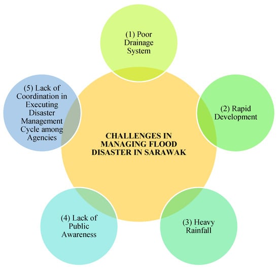 The issue of inadequate drainage systems has resulted in tremendous environmental challenges globally, especially floods. Residents are mostly affected by these flood events due to inadequate drainage systems and in particular, those residing along flood plains, low land areas, and other coastline areas. At the same time, the challenge in managing floods is additionally impacted by the community’s attitude or advancement that does not consider the principle of ecological preservation [61]. Extensive rainfall during the rainy season is also one of the challenges in managing flood disasters [62]. The vast varieties of the precipitation in recurrence and force have inclined to vacillations in the waterway streams that have brought about atmosphere-prompted disasters such as floods, landslides, and so forth [63]. The lack of coordination in executing the disaster management cycle among agencies is also identified as a primary challenge in managing flood disasters. According to [64], it is mentioned that the absence of authoritative coordination and participation can prompt hindering impacts on people and budgetary assets.