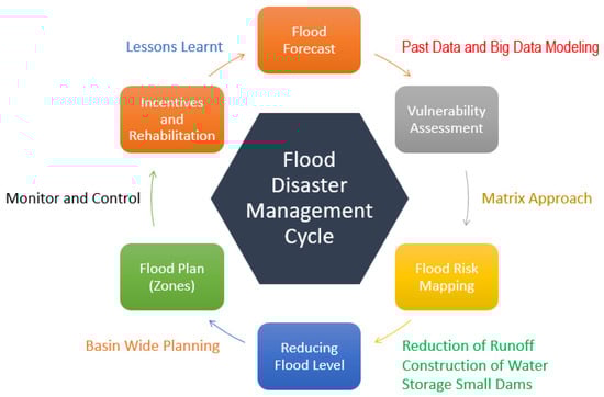 The disaster management schemes are variant because every disaster class has a different response approach. Similarly, it is essential to utilize the new big data management approaches. Past data are also available in many countries, so big data analysis methods should forecast the flood trends and possible impact levels. Based on the forecast, the framework proposes using a matrix approach to rank the areas that are vulnerable to floods. The attention should be given to higher vulnerable areas and state resources can also be utilized accordingly. Based on the vulnerability matrix, suitable actions to be taken include: maintenance of the existing reservoirs and construction of new water storage dams ranging from small- to large-scale dams. Possible suitable actions should be taken to reduce the runoff or divert the flood into various reservoirs. These should be at a certain safe distance from the populated areas and special attention should be given to the city drainage system. Runoff water should be diverted to possible flood pocket zones to save the cities and human lives. In case of possible resettlements, incentives should be given to people for rehabilitation if any damage occurred due to floods. Pertinent data should be managed, including all possible data requirements needed for the framework. State-level and country-level special data centers should be developed to keep a proper track of the rain records and the possible vulnerability to floods. In the last phase, a lesson learned session should be conducted, and the results should be integrated with the framework to improve the framework in future disasters and their management. The proposed framework can also be used in other countries facing flood disasters with similarities. There can be some minor variations that can be carried out in the framework to meet the local conditions of any country. The main spectrum of flood disaster management will remain the same.