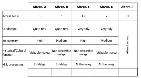 Among the different valuation techniques, the discrete choice experiment (DCE) method allows the estimation of the value that visitors place on each ecosystem service of a pasture. A DCE asks respondents to choose the preferred alternatives (i.e., policy scenarios) from a number of alternatives, each consisting of different levels of realization of the attributes of the good or service to be valued, in a sequence of choice tasks [4]. The monetary value of each ES can support the adoption of correct management policies because it allows explicit trade-offs in the decision-making process [5].