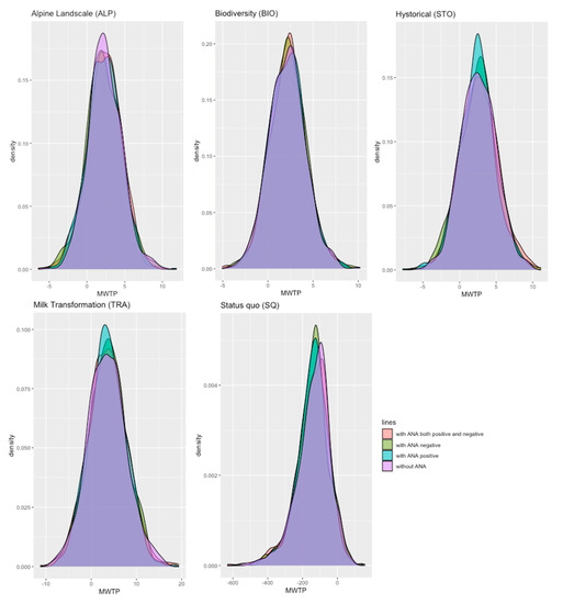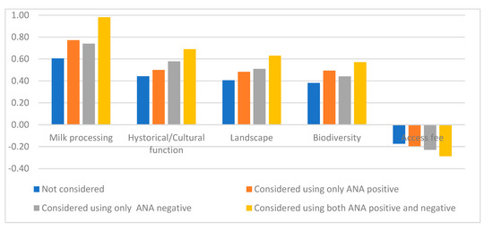 In terms of the relative importance of attributes, milk processing is the most preferred attribute across all the model’s specifications. Analyzing the mean coefficient estimates, it emerges that the relative order of importance of the different attributes without considering ANA is: Milk processing → Historical/Cultural function → Landscape → Biodiversity. The order is slightly different considering only ANA positive (Milk processing → Historical/Cultural function → Biodiversity → Landscape), while it does not change if ANA is stated using the negative way (e.g., non-attended attributes are declared).