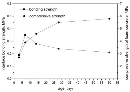 Figure 2 shows the effect of age on the interface bonding strength and the compressive strength of the foam concrete. As can be seen in Figure 2, the compressive strength of the foamed concrete increased with age, and the increase rate is rapid within 28 days. However, after 28 days, it increased slightly and tended to be stable gradually. The reason is that the strength of the foamed concrete is formed mainly due to the hydration of cement, and higher compressive strength can be obtained with an increase in age. The interfacial tensile bonding strength first increased, then decreased, and then tended to decrease slowly. This can be attributed to fact that the interface bonding strength is the bonding ability of foam concrete for composite wallboard, but the bonding interface is a weak link, and the shrinkage of foam concrete is 10 times that of ordinary concrete [20]. Wan [21] believed that the drying shrinkage of foamed concrete is divided into three stages, the first stage of which, water loss, is not obvious. In the second stage, the foamed concrete begins to shrink, but the water loss is less. Finally, the third stage basically stops the shrinking. After curing, the foamed concrete will slowly lose water in the natural environment in a saturated state. Before 7 days, the strength of the foamed concrete is dominant, the interface bonding strength increases, and the bonding strength increases. The huge difference in dry shrinkage will generate shrinkage stress, leading first to micro-cracks and damage inside the interface [22]. Then, this destroys the bonding effect of the interface and the uniform distribution of stress on the interface. The dry shrinkage value gradually increases, resulting in the continuous expansion of micro-cracks and accumulation. This damage leads to a decrease in interface tensile bond strength.