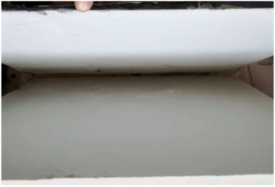 Similarly, a polyurethane adhesive with a cohesive strength much greater than the tensile strength of the foamed ceramic was used to coat the foamed ceramic specimen with a density of 330 kg/m3 for four weeks. Then, the freeze–thaw cycle test was carried out. It was found that after more than 40 freeze–thaw cycles, the alternating tensile and compressive stress generated by the temperature change and the tensile and compressive stress generated by the shrinkage superimposed more stress than the bonding strength of the surface. The bonding surface of the foamed ceramic and the polyurethane adhesive gradually cracked (Figure 6b). This indicates that the damage to the bonding surface by the freeze–thaw cycle is much more serious than that to the material itself.