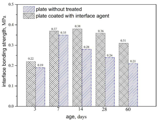 It can be seen in Figure 4 that after the surface was coated with the interface agent, the interface bonding strength under the age of 28 days increased first and then tended to be stable, and it decreased slightly after 28 days. However, its tensile bonding strength at each age was higher than the interface bonding strength when the foamed ceramic board was combined with the foamed concrete. This shows that the coating of the foamed ceramic material with the interface agent can improve the interface bonding strength. After the interface agent was painted, an elastic and good bonding strength isolation layer formed between the foamed ceramic plate and the foamed concrete. It could partially absorb the stress generated by the curing process of the foamed concrete, and the interface agent could be well sealed. The pores on the surface of the foamed ceramic material increased the effective contact area between the foamed concrete and the plate.