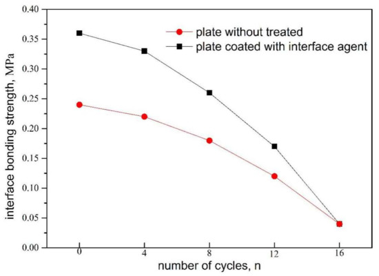- With the increase in the number of freeze–thaw cycles, the interface bonding strength decreases gradually, and the damage to the bonding surface by the freeze–thaw cycle is much more serious than the damage to the material body. The coating of the interface agent does not improve the composite wallboard. Brushing the interface agent did not improve the freeze–thaw resistance of the interface of the composite wallboard.