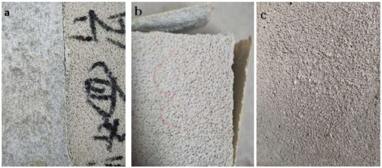 Damage characteristics of the interface of the specimens caused by freeze–thaw cycles: (a) surface damage characteristics of the composite wallboard coated with the interface agent on the surface of the foamed ceramics; (b) damage characteristics of the foamed ceramic specimens coated with the polyurethane adhesive on the surface; (c) interface damage characteristics of the composite wallboard coated with the interface agent on the surface of the foamed ceramics. The interfacial agent layer that suffered from freeze–thaw destruction was visible on the surface of foamed concrete.