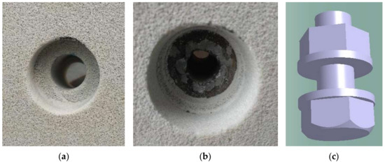 The test found that, after drilling holes and implanting diameters of 14 mm on 100 mm-thick foamed ceramic plates and foamed concrete, the pull-out force of the viscose casing with a buried depth of 50 mm could reach 2.0 kN and 1.9 kN, respectively. Additionally, the larger the pipe diameter and the greater the burial depth, the greater the pull-out force test value. Therefore, a structural connection scheme of pre-embedding sleeves to prepare composite wallboard was designed. Specifically, a penetrating circular hole with a diameter of 22 mm was drilled on the board, and a counterbore with a diameter of 40 mm and a depth of 20 mm was drilled on one side of the board surface (as shown in Figure 7a). A sleeve was built in (as shown in Figure 7b) and the connecting bolts were put into the casing (as shown in Figure 7c). The bolts not only pre-tightened the composite wall panels, but also connected with the main steel structure.