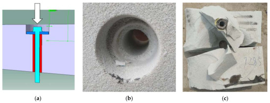 Considering the tensile and compressive stress of the foamed ceramic board due to temperature change and foam concrete shrinkage, the foamed ceramic board with a thickness of 100 mm was used as the base material to test the foamed ceramic board under the action of the vertical board surface force by means of jack pressure. The single-point anti-failure load of the long-hole casing with glue and without glue was studied. The test loading device is shown in Figure 8a. The test found that if the casing was directly put into the long hole, the casing disc compressed the foamed ceramic plate when it was squeezed. When the load was about 800 N, the foamed ceramic under the disc began to be crushed, causing the casing to sink, and the casing was pushed out. The maximum load was greater than 4 kN. However, the foamed ceramic plate was not damaged, but only partially compressed (Figure 8b). If the reinforced plastic was used to bond the casing to the long hole, when the load was above 7 kN, the plate was damaged and the casing was still bonded in the long hole (Figure 8c). Therefore, the connection structure of the composite wallboard for the exterior wall should adopt the scheme of penetrating long holes and rubber sleeves.
