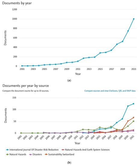 Number of documents concerning flood risk and the BE in view of resilience and adaptation: by year (a); by year by journal just considering the top 5 journals for such publications (b). Source: www.scopus.com (28 February 2022).