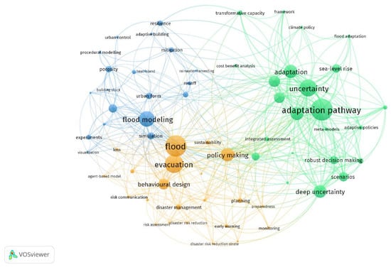 In Figure 2, it is possible to observe three clusters, which show thematic grouping around different topics. Two clusters are related to the BE and its components: the blue cluster is related to BE solutions, both at the urban scale and at building scale; the orange cluster identifies behavioral-based studies that also connect flood risk with emergency management, thus focusing on the BE users as active components. These two clusters are considered for Section 3 overview. Finally, the green cluster is focused on uncertainties and adaptation pathways and is critically assessed in Section 4.