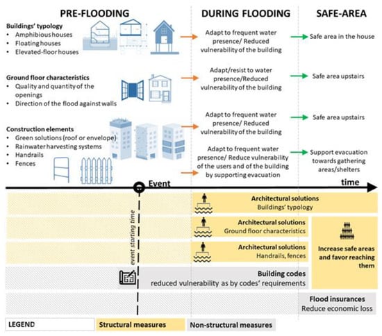 Buildings can integrate solutions that provide relief and resilience increases to flooding in the short-term, during the flooding, and in the aftermath of the event. A conscious design of buildings in flood-prone areas entails the choice of peculiar building typologies or the integration of different technological solutions, which have been developed and analyzed in the last years to be applied to buildings, so as to improve their performance with respect to flood vulnerability. However, in addition to such structural measures, in order to support buildings’ strategies for flooding, also non-structural measures can be taken, such as regulating resilience by means of building codes and providing flood insurance for buildings in flood-prone areas.