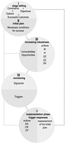 - In the fourth step, the identified necessary conditions of success are transformed into indicators. Those indicators are called signposts, and a monitoring system is implemented to track them [130]. In this stage are also defined four groups of actions that can be taken to adapt to ensure that the objectives are achieved [129]: