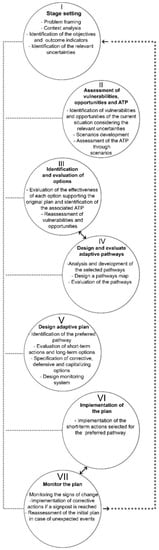 Adaptive policymaking (APM) (Figure 5) is an approach developed to help decision-makers dealing with uncertainties by choosing the most robust policies for complex systems, whose behavior cannot be predicted with the aid of static analyses. Strategies must be decided, although the future might be different from the assumption made; therefore, they should be adaptive and change in light of new data, reducing the uncertainties [124].