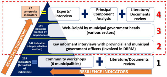 Despite the existence of a wide range of literature on indicators of disaster resilience in various geographical contexts that have been developed by different agencies and academia, not much has been done to include the insights of practitioners at the local level. This paper seeks to address the lack of practitioner insight and perspective by proposing a mixed methodology in developing composite indicators for the resilience of an island community to disasters. We used a combination of participatory approaches, such as semi-structured interviews with key informants, the web-based Delphi method, and expert interviews through a case study site in the Philippines—the Batanes island province. Principal Component Analysis (PCA) was utilized to analyse the data from web-Delphi, and the results from the content analysis of the interviews were used to support these findings. From a broad list of 144 indicators, the process identified 22 composite indicators for assessing the disaster resilience of an island community. We conclude that the development of new approaches for assessing disaster resilience of island communities is a positive step towards a better understanding and operationalization of the concept of resilience. The process followed in this paper is a significant milestone in developing new approaches to answer the question of what makes an island community resilient to disasters.