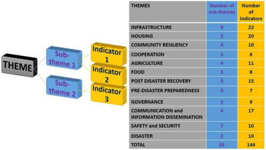 Hierarchy/Structure and number of themes, sub-themes, and indicators of disaster resilience of the island community after the Key informant interviews.