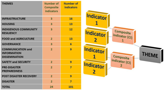Hierarchy/structure and number of themes, composite indicators, and indicators of disaster resilience of the island community, after the web-Delphi, Principal Component Analysis and interviews of Experts.